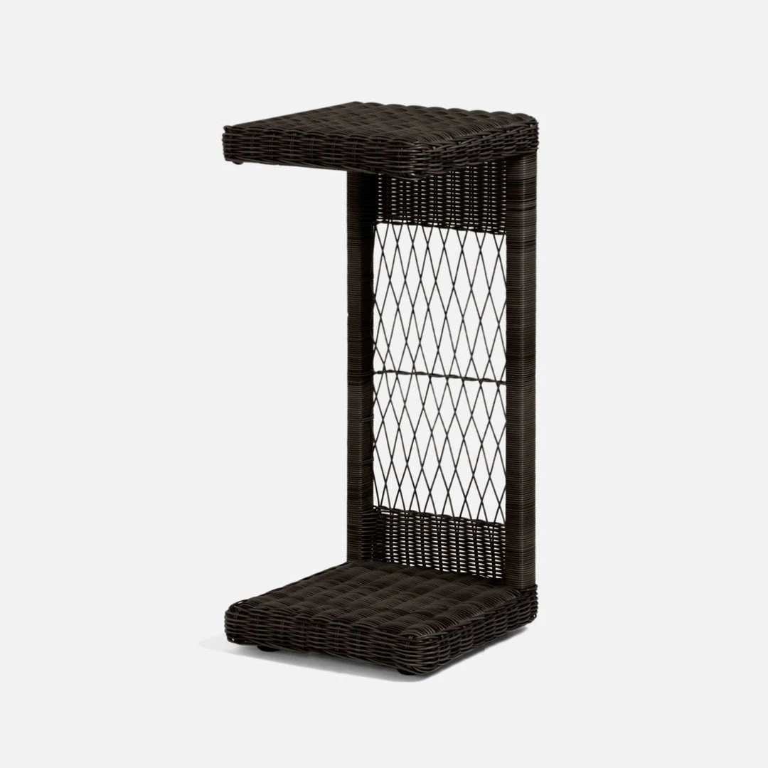 Happy hour by the pool is a breeze with the Bellamy Drink Table in Graywash from Made Goods, This versatile piece is woven from faux wicker in a gray washed finish. The C-shaped design comfortably extends over a deck chair or chaise lounge, and the textured top is broad enough for a cocktail or several.