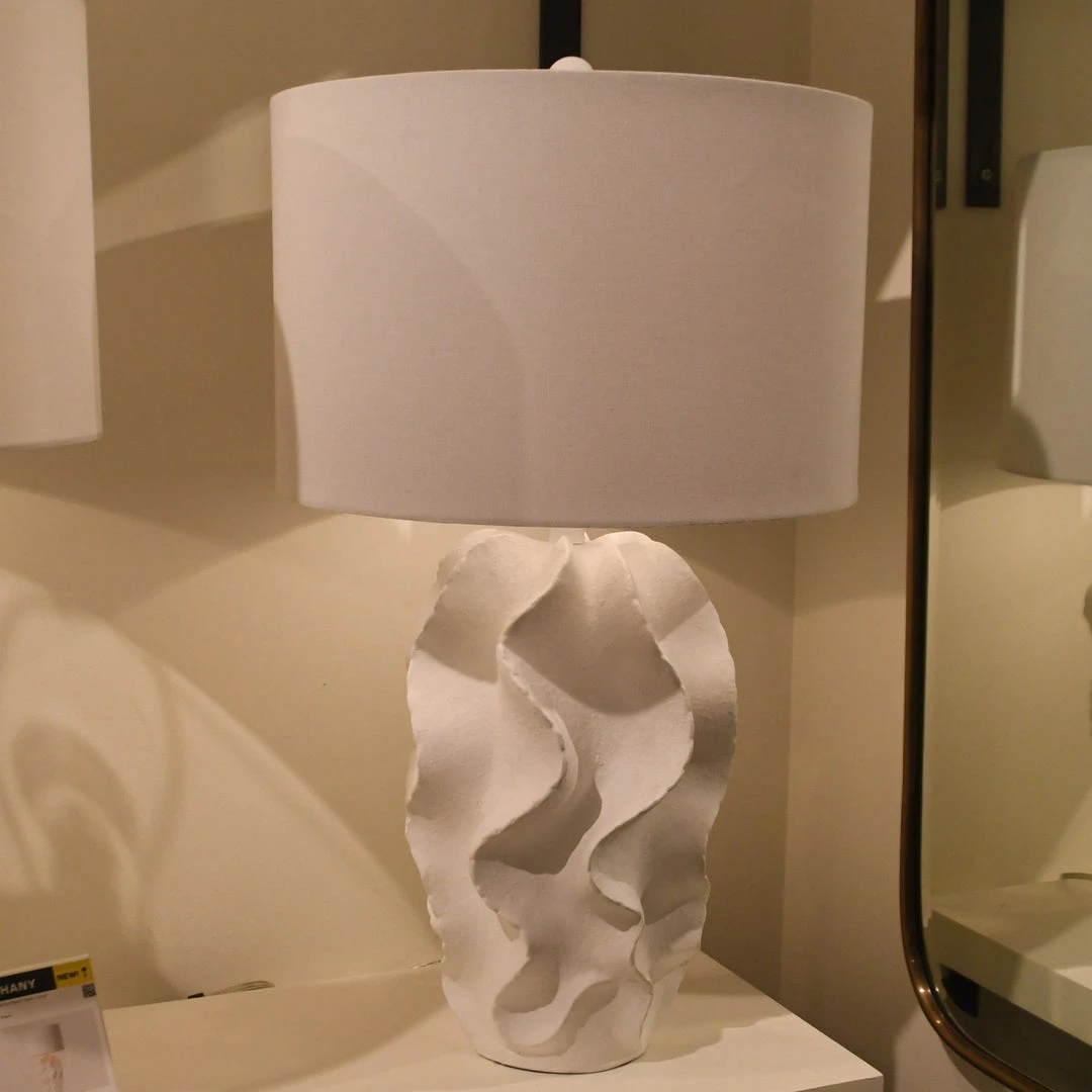 Undulating curves of mold-cast textured white resin soften the shape of the Bethany Lamp from Made Goods. Topped with a linen shade, the overall look is pure elegance. Illuminate any area by placing this beauty on a console, buffet or nightstand.Â