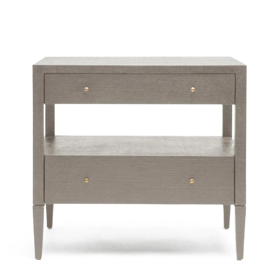 Made Goods Conrad Low Double Nightstand in Seal faux raffia offers a rectangle shaped bedside table that gives you style and function. Plenty of storage is easily accessible in its 2 self-closing drawers accented with brass drawer pulls and an open shelf between the drawers offers either storage or a place to display your treasures. Modern bedside tables designed with clean contemporary lines give you an abundance of tabletop surface for lighting, sculptures or a vase of flowers. Side tables like the large Conrad can also be used as a living room side table or consider using it in your home office beside a chair. *This item is handcrafted and may show slight variation in size from one piece to another.