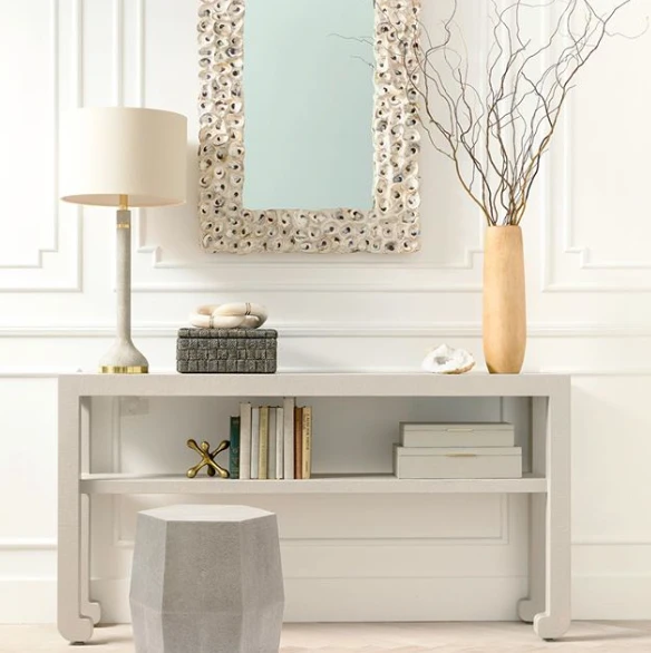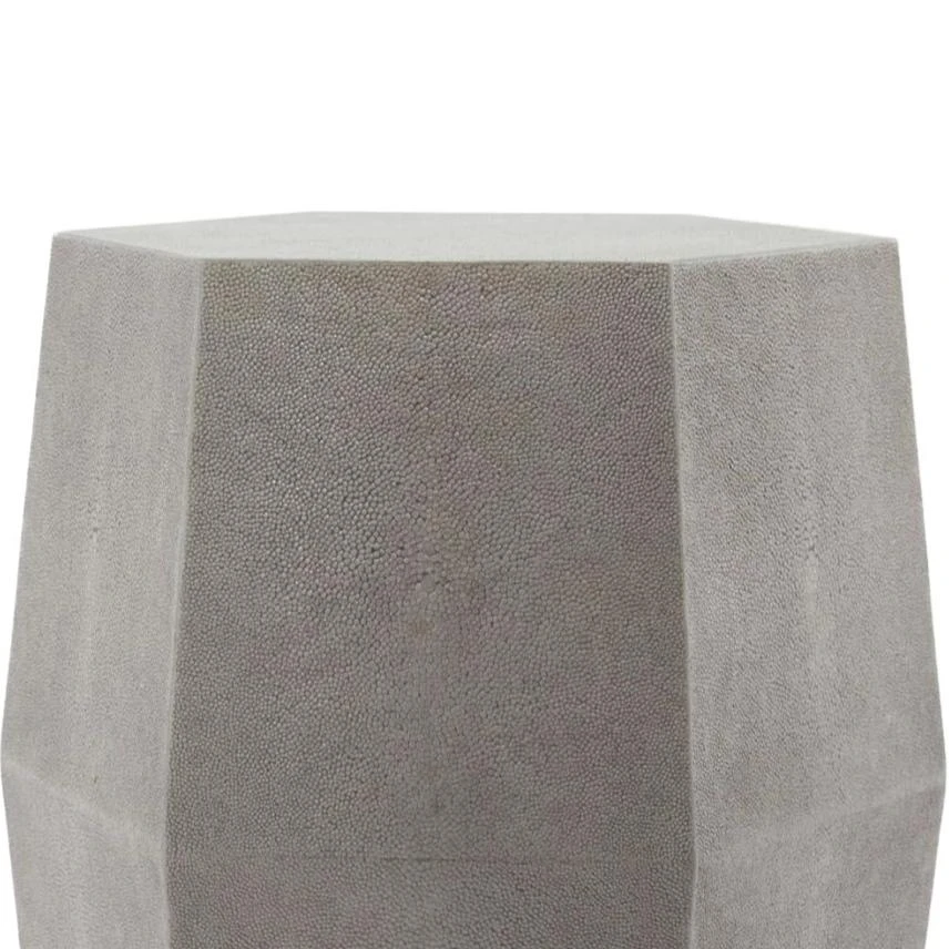 The Made Goods Daryl Stool in Castor Gray faux shagreen reflects a modern contemporary hexagon style. Elegantly tapered at the top and base, this neutral colored seating has a flat top surface. Use as a side table or stool–the choice is yours. The Daryl is just as functional as extra seating in your home or office as it is when used as a side table next to an occasional chair to put your morning cup of coffee. Like versatile garden stools, this extra seating can be placed on one side of your coffee table for intimate conversations. We see this versatile piece also used as a display stand for a large decorative sculpture, plant or flower arrangement. *This item is handcrafted and may show a slight variation in size from one piece to another.