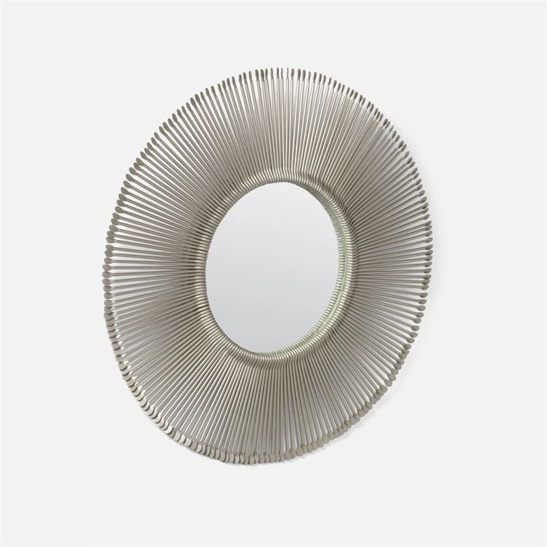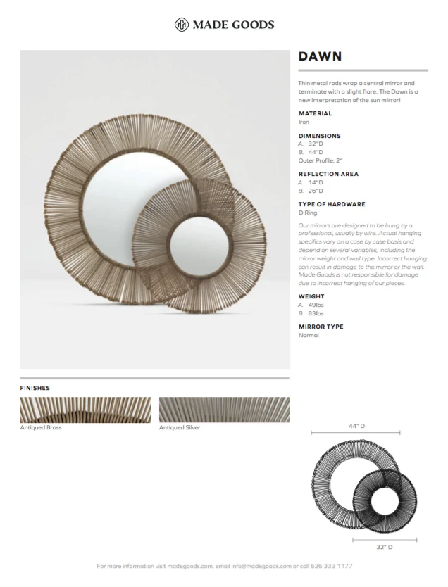 The Dawn Mirror in Antiqued Silver Iron Small from Made Goods is the perfect addition to any home. Inspired by vintage design, the round contemporary Dawn features metal rods that will create a modern look to any wall in your home or office. Wall mirrors like this beautiful reflective piece can be hung over a console in your entryway, over the credenza in your office, or over the vanity in your bathroom.Â
