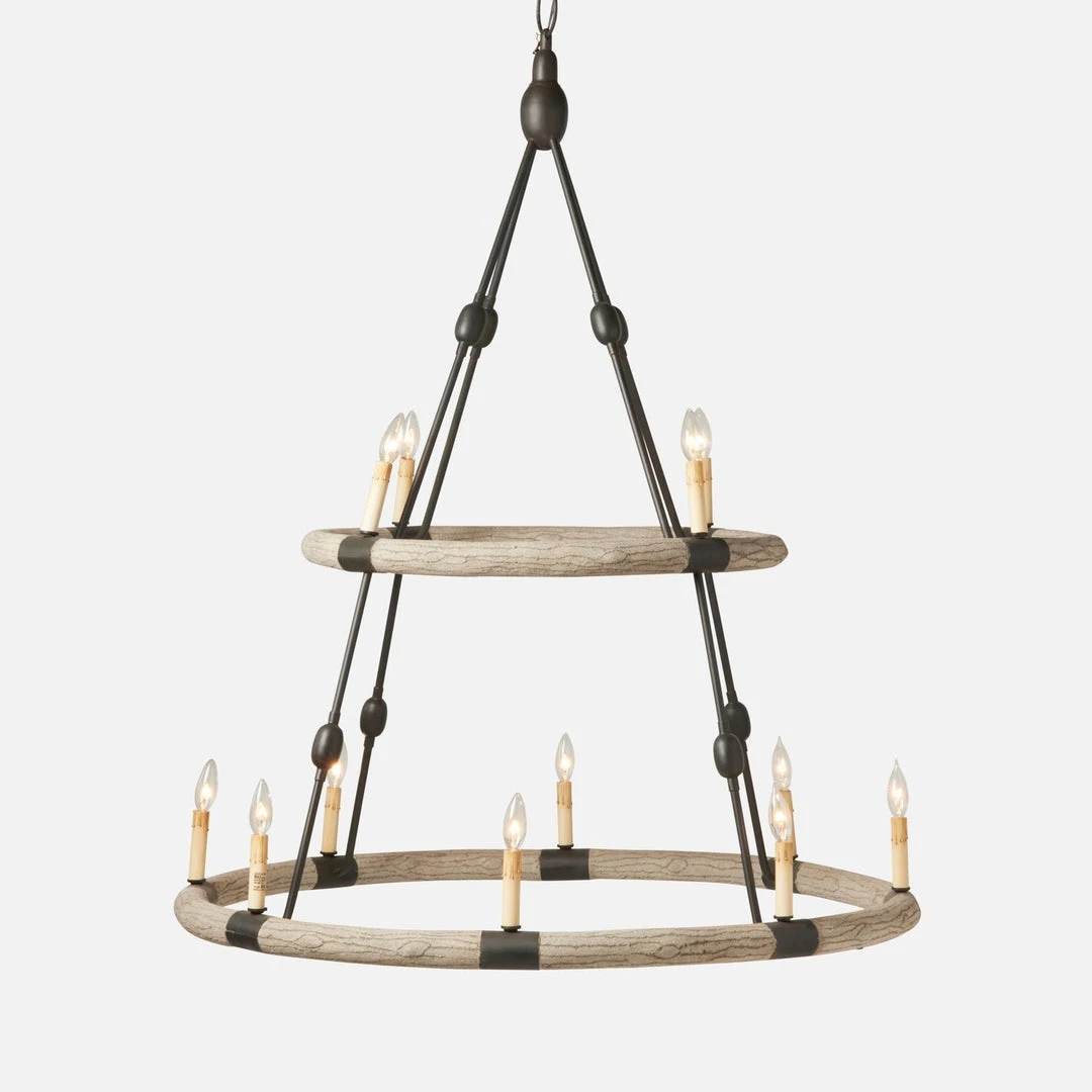 The Dean Chandelier in Gray and Black from Made Goods features a faux bois circle that is the support for twelve chandelier lights anchored to a natural iron base. Iron also creates a decorative support. The Dean Chandelier is a classic piece and is perfect for entryways, dining rooms and living spaces alike.