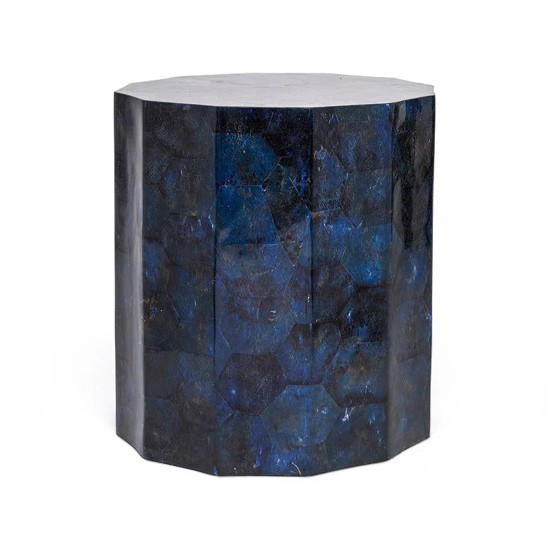 The Enzo Stool in Dark Blue Pen Shell from Made Goods is created with a molding process, requiring heat. Natural variations in color make this round, faceted piece totally unique and the deep blue color is dramatic and bold. This modern design is a perfect addition to home or office, as extra seating or as a small side table.