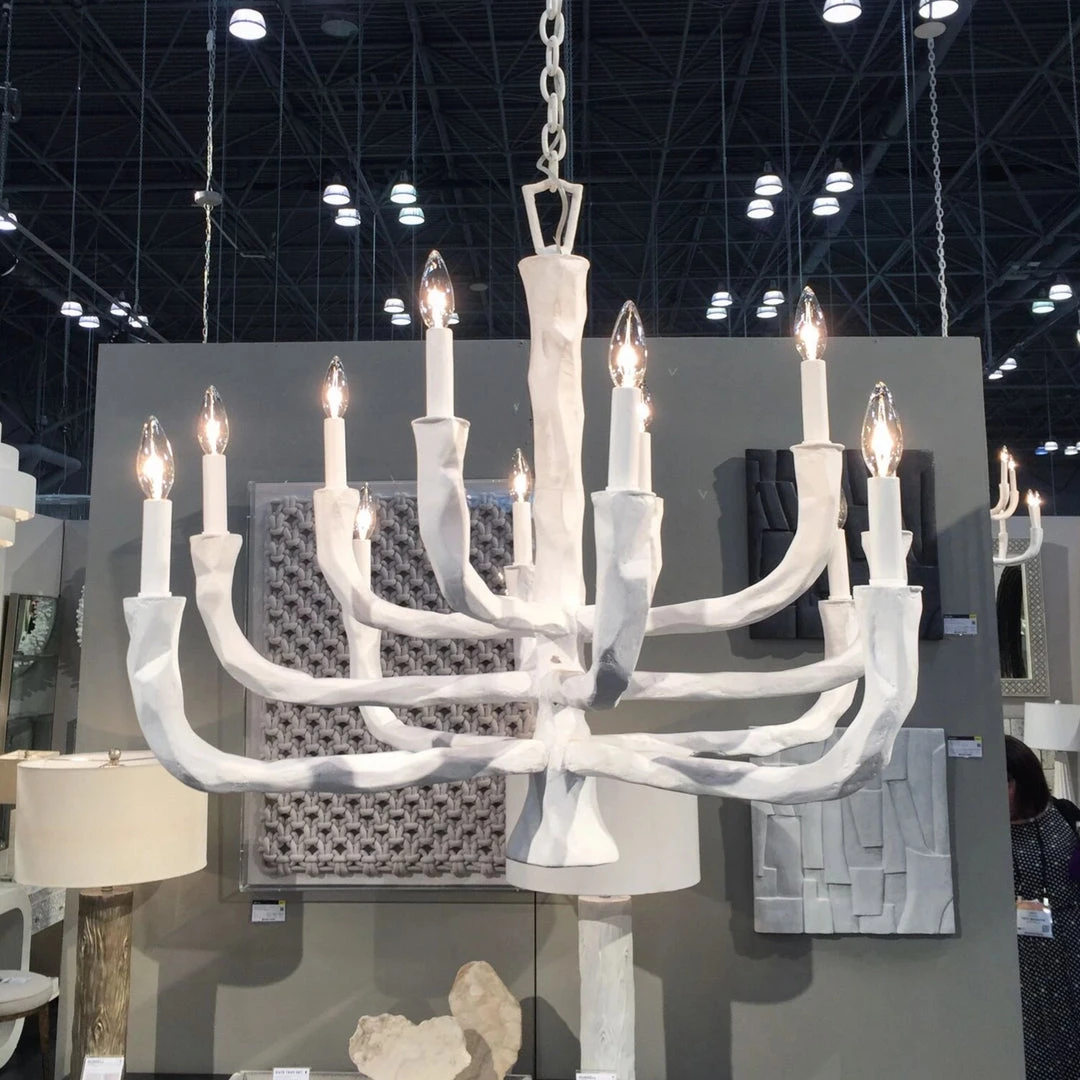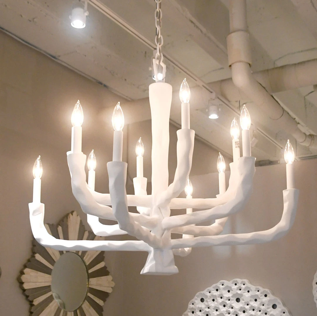 Modern and organic, the Fawn Chandelier from Made Goods features 12 arms of white concrete. The white branches of the Fawn light extend around the chiseled finished frame. The strong aesthetic of the fixture by Made Goods creates a strong presence. Â We love the Fawn in an entry way or foyer, bedroom or dining room. Â *Concrete material natural distresses. Â Minor cracks and imperfections are to be expected.