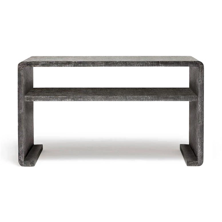 The Gustav Console in Charcoal Faux Linen from Made Goods presents a dramatic waterfall style design completely covered in faux linen. The Gustav highlights curved corners and bent legs showcasing a bold and striking shape ideal for entryways, dining rooms, and living rooms alike. The neutral color of the Gustav works beautifully with any home decor scheme and the additional bottom shelf offers a variety of storage and display options.