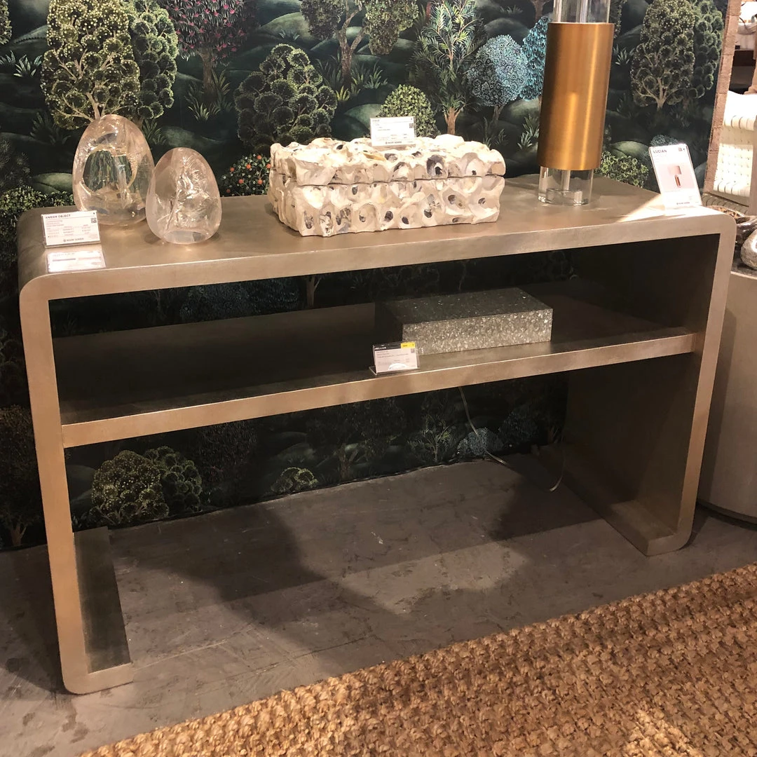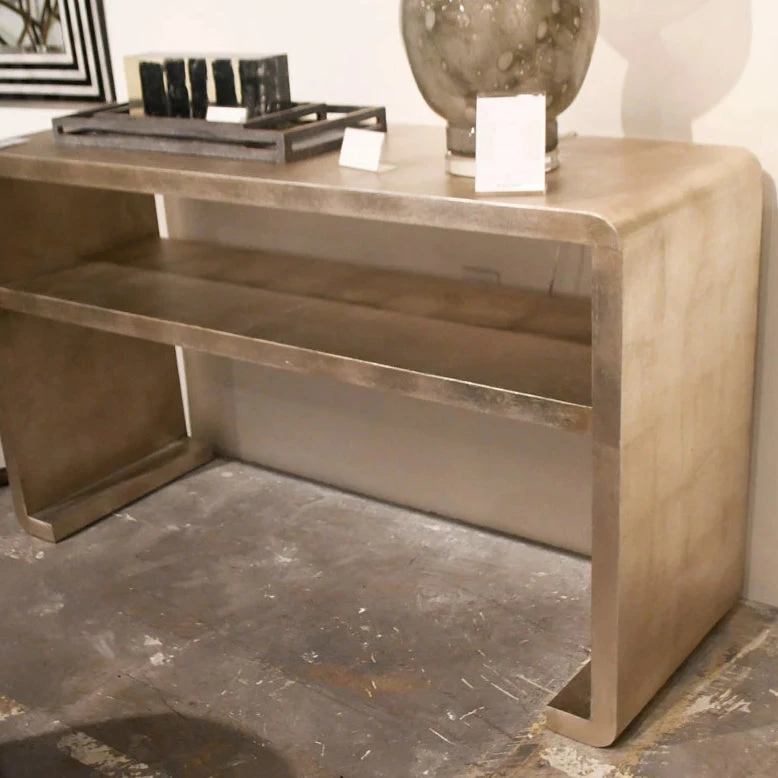 The Gustav Console in Warm Silver from Made Goods presents an eye catching waterfall style design fully finished in faux linen. The Gustav offers curved corners and bent legs delivering a strong and striking silhouette perfect for entryways, dining rooms, and living rooms alike. The neutral coloring on the Gustav Console works well with any design scheme and the additional bottom shelf offers a multitude of storage and display options.