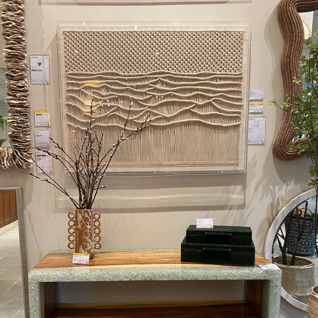 From meticulously woven macrame to wavy strands of tightly wrapped fabric, the Hanovi Wall Art in Large from Made Goods features spectacular handcrafted details. This simple but dramatic, neutral artwork is the ideal piece to grace any wall of your home. The rectangle shape wall decor is an immediate conversation piece.