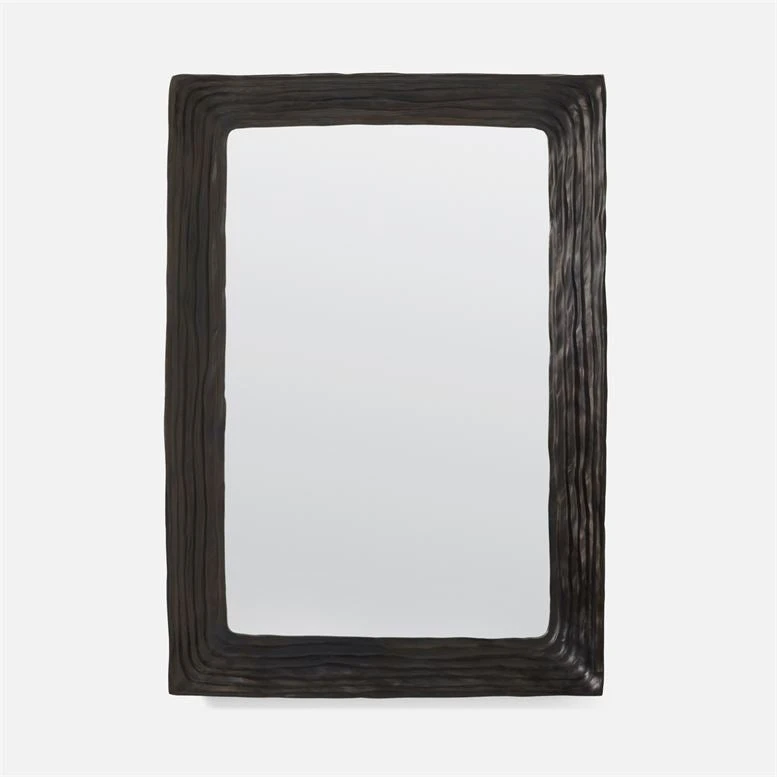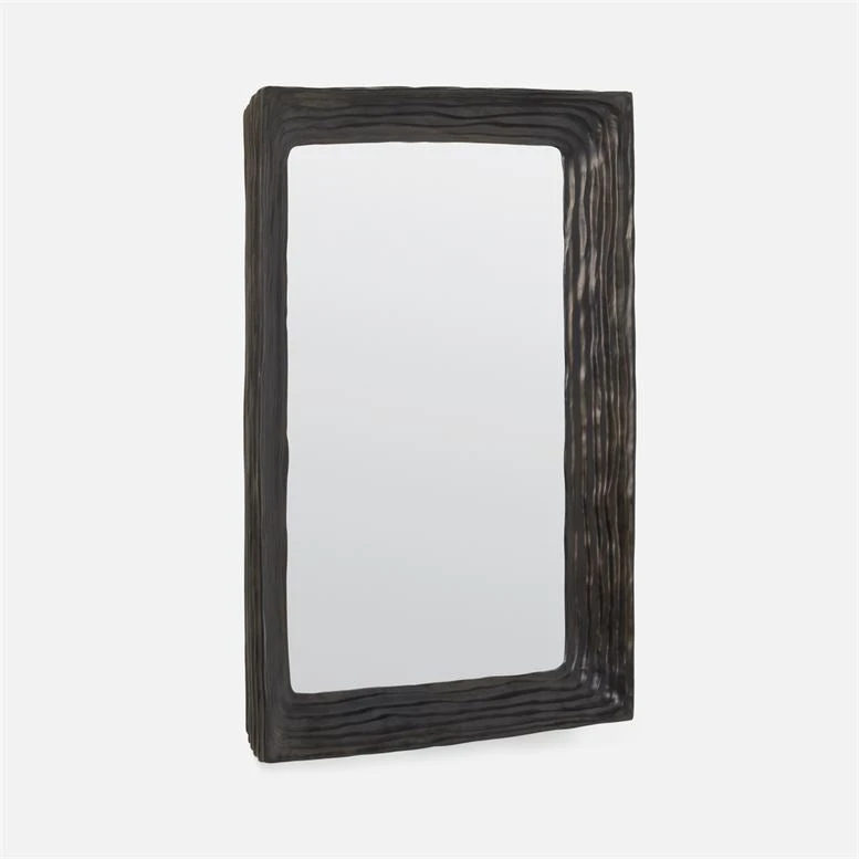 The Hetty Rectangular Mirror in Bronze from Made Goods features layered, wavy lines that lighten any space, This mirror has a rippled bevel style frame with an approximate 4” depth. The Hetty is a perfect touch of luxurious style for entryways, bathrooms, and living spaces alike.