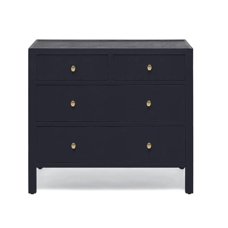 The Jarin Dresser from Made Goods showcases a functional size for smaller spaces in a Dark Navy Faux Belgian Linen finish. The three drawers offer the perfect amount of storage and gold finished hardware adds stylish detailing.  Dressers like the Jarin from Made Goods work beautifully in the guest bedroom or master suite and also work well as a stylish storage piece in the dining room or home office.Â