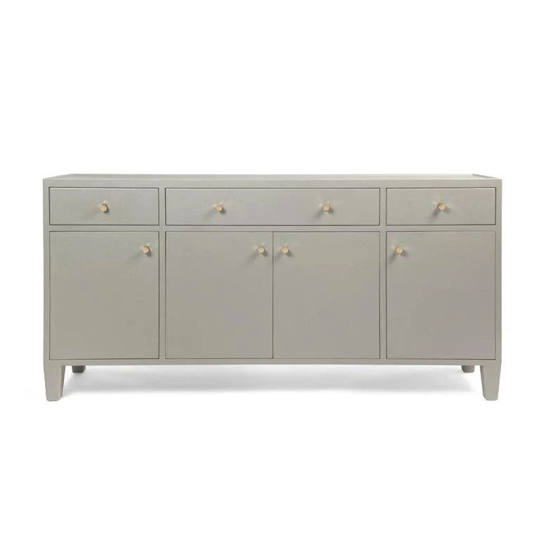 The Jarin Buffet in Light Gray Faux Belgian Linen from Made Goods features a sophisticated faux Belgian linen finish and ultra-versatile storage options for your home. The textured finish gives the furniture a stand-alone appeal. Bottom-mount European glides and the lipped detail around the top surface are among the Jarin’s considered details. Siimply-designed brass knobs complete the look of luxury. Easy open and close, the glides on the drawers keep dinnerware, linens, glassware, and accessories organized and easily accessible.