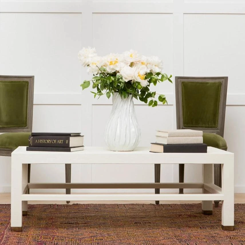 The Jarin Coffee Table from Made Goods features a rectangle base covered in white Belgian linen. Â The texture and sheen of material are highlighted on the fully finished furniture. Â The Jarin table works well in all rooms with its open-air base and brass capped feet.