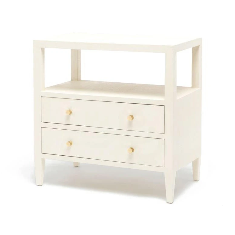 The Jarin Double Nightstand from Made Goods features a white linen material making this a classic piece.  The two drawers offer just enough storage for the side of the bed.  Modern bed side tables like the Jarin Double Nightstand offer style and function with the detail of the knobs and tapered legs working perfectly in any space.