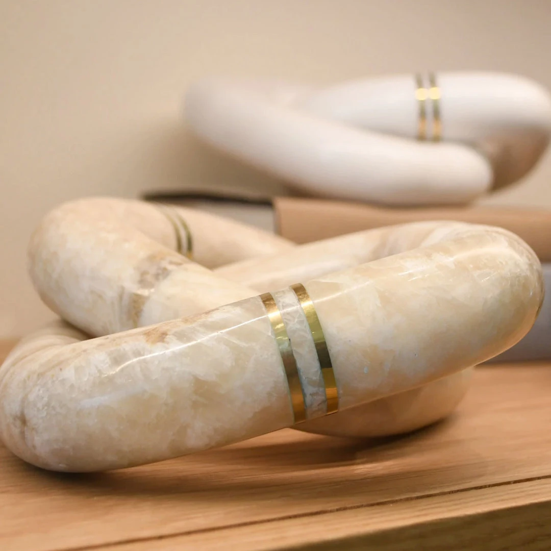 The Kelton Sculpture from Made Goods features a linked natural stone chain with brass inlay.  Place the Kelton on a coffee table or bookshelf for a stylish designer touch. The neutral coloring works well in a multitude of rooms and plays well for a variety of home decor schemes from modern to transitional.