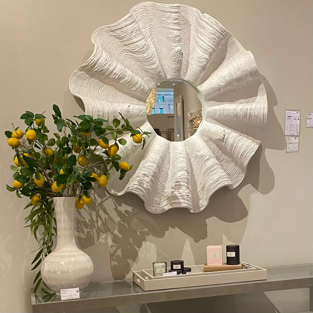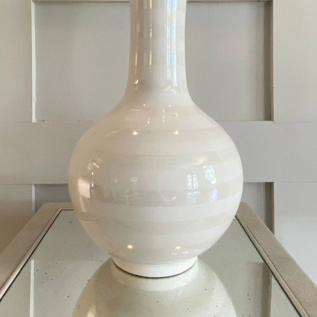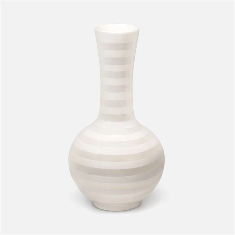 The Nephele Vase from Made Goods features a minimalist style with white on white stripes. This tall handmade and glazed ceramic vase is lovely placed individually or in a grouping for a more dramatic presentation on tabletops, shelving, and desktops alike.