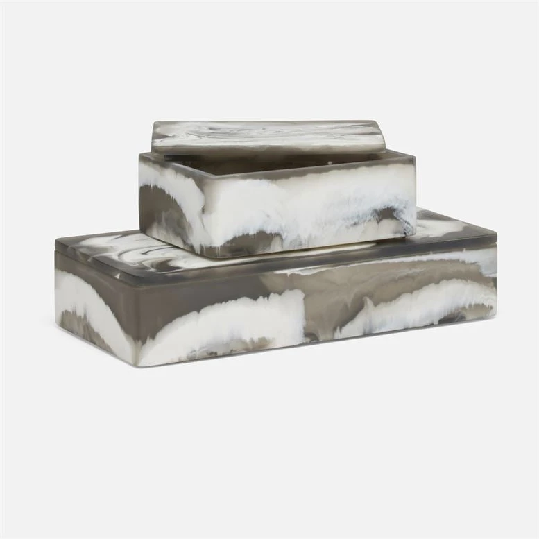 Mesmerizing patterns emerge from our Osias Box Set in Black from Made Goods. This luxurious box set is crafted from swirled resin. These versatile rectangular boxes are topped with fully removable matching swirled resin lids. Place the Osias boxes in the office on the desk, at the entryway, or on shelving to store all your essentials in style. *Set of two.