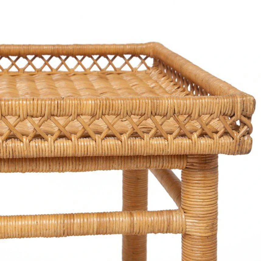 Made Goods Sarah Single Nightstand in Natural Rattan, a single side table, offers casual, contemporary elegance. The tray designed top of this square bed side table provides space for a lamp while a bottom shelf is available for books or decorative items. Versatile for use anywhere in the home, side tables like the Sarah work well with a myriad of decor styles.