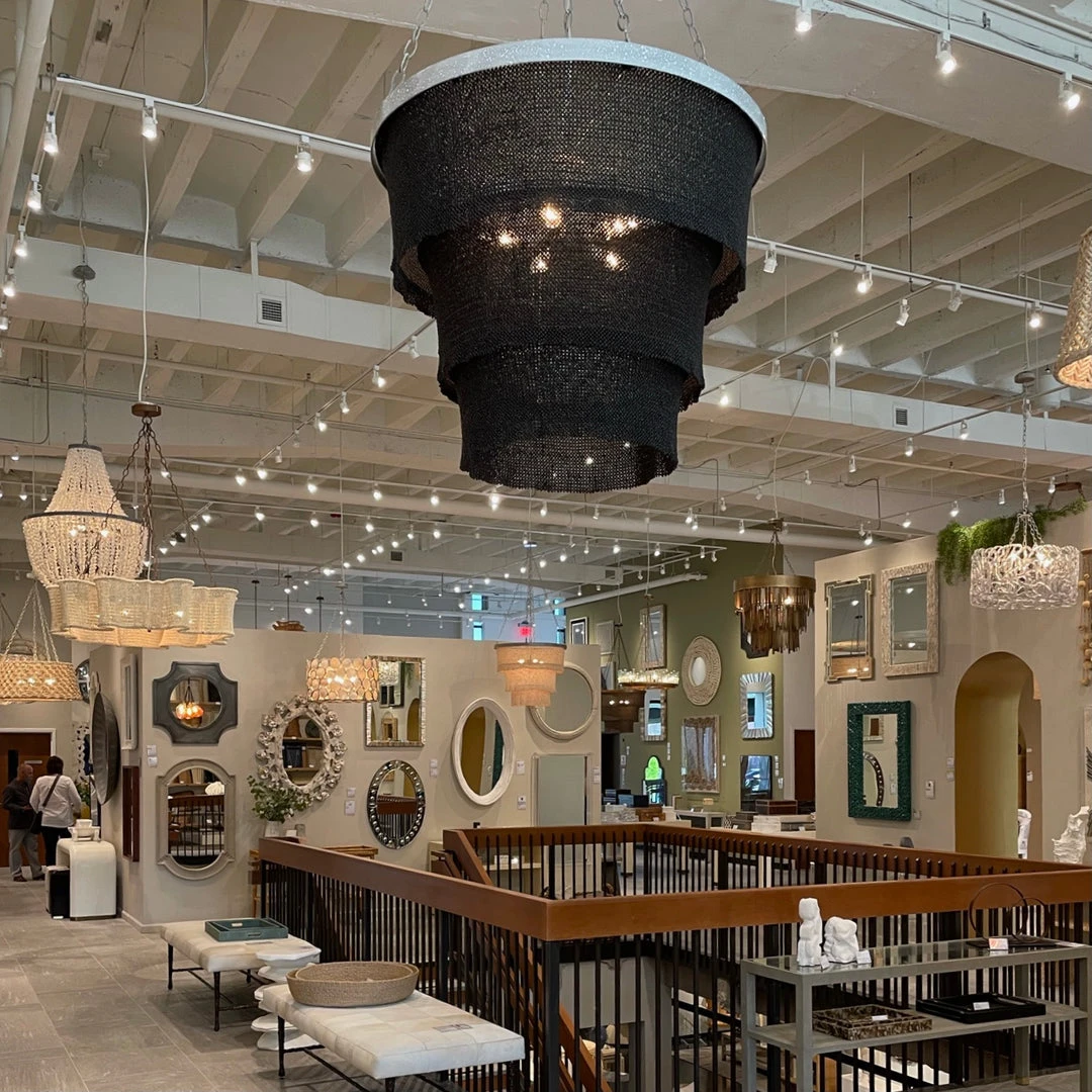 The Patricia Chandelier with Black Coco Beads and Silver from Made Goods is woven tightly into three overlapping concentric rings that move languidly in a round profile. With a slight ruffle along the edge and flirtatious silhouette, the Patricia is pure glamour.