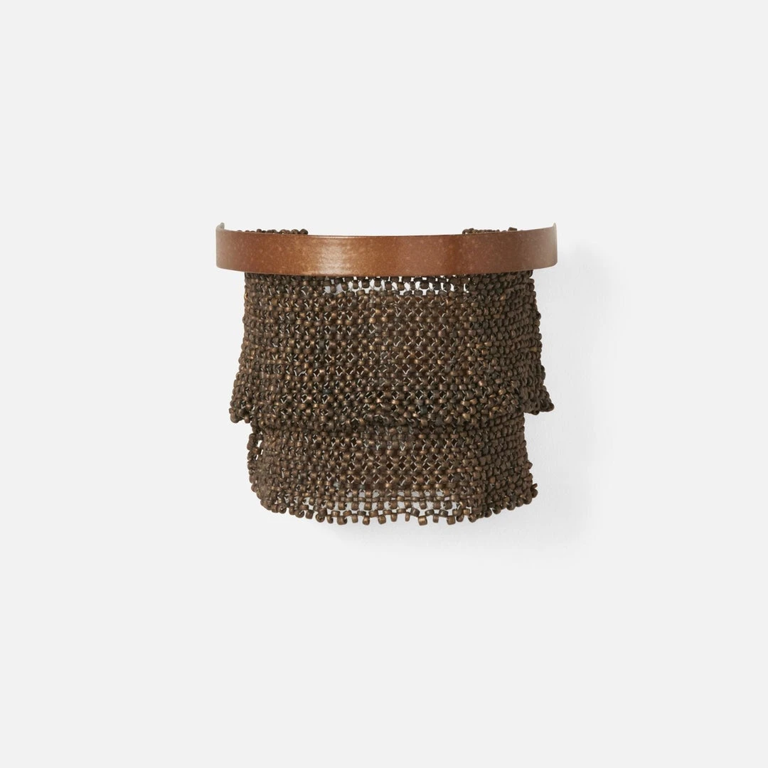 With a sophisticated yet casual silhouette, the Patricia Sconce Bronze and Gold from Made Goods is pure glamour. Coco beads are woven tightly into three overlapping concentric rings creating a mesh that move languidly in a semicircular profile. The unique design of this stunning wall light adds dramatic visual interest to hallways, bathrooms, and dining rooms.