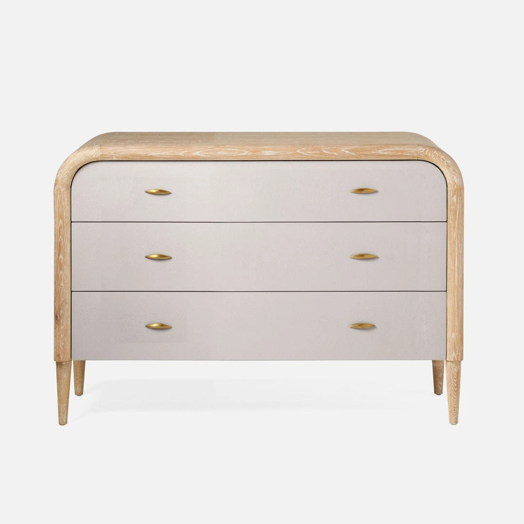 The Pierre 48″ Dresser in French Gray from Made Goods features a rounded frame that takes its cue from the late ’60s, with whitewashed oak and faux shagreen drawer panels making it a contemporary beauty. The shape highlights the wood’s gorgeous grain and tapered legs provide a shapely finish.