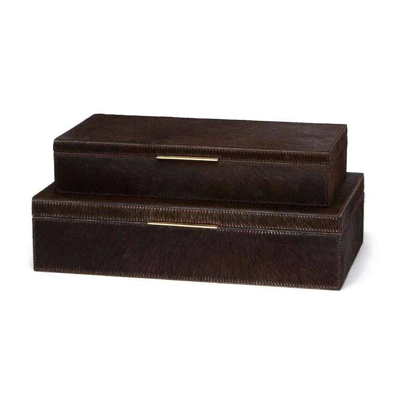 The Ralston Box Set in Dark Brown Hair on Hide from Made Goods showcases two convenient sizes for storing an assortment of your treasured items. Crafted from full-grain leather and an elegant brass-lipped handle, these uniquely beautiful containers beg to be seen on your coffee table, bookshelf or console.Â
