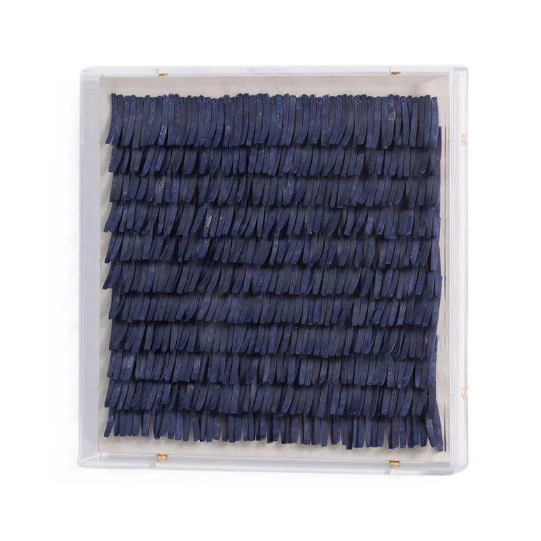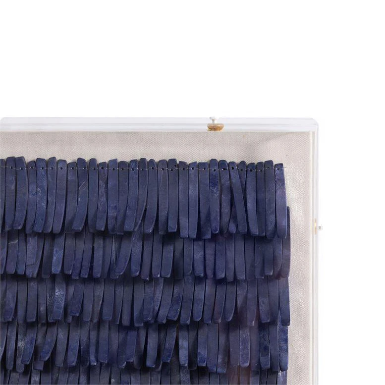 The Made Goods Tarni Artwork in Navy Coco Sticks is crafted from hundreds of tiny coco sticks affixed like fringe to create a dynamic piece for indoor or outdoor spaces. Encased in an acrylic frame, the contemporary Tarni brings subtle visual texture to your home. Bring the bold coloring of the Tarni to any room for a dramatic visual layer.