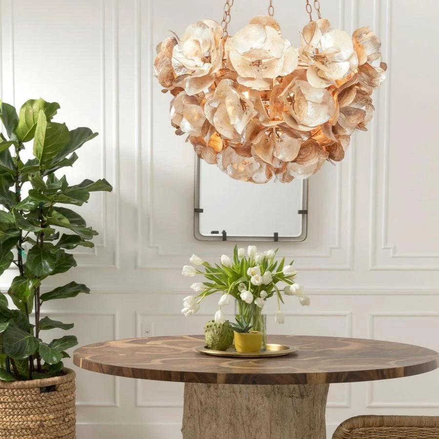 Made Goods offers the Venus Chandelier in a chic Champagne finish. If you’re looking for a one-of-a-kind true work of art, this chandelier lighting has everything you could want. Saddle oyster shells are hand placed into floret shapes of the Venus Chandelier that take this hanging light from casual contemporary to a high-end chandelier. Place this large organic lighting in your dining room, living room or master suite. *Natural variations in this material may occur.