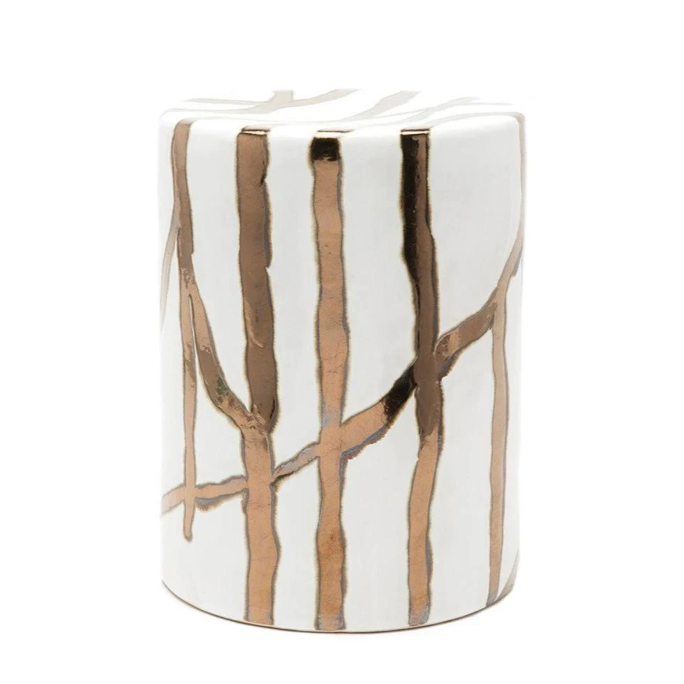 The Made Goods Willow Stool in gold, inspired by Asian calligraphy, reflects an organic, bold, branch-like design. Hand-painted in gold and white, this modern stool can be used as seating or as a side table in any living area of the home.  The willow stool is a great addition to any room.