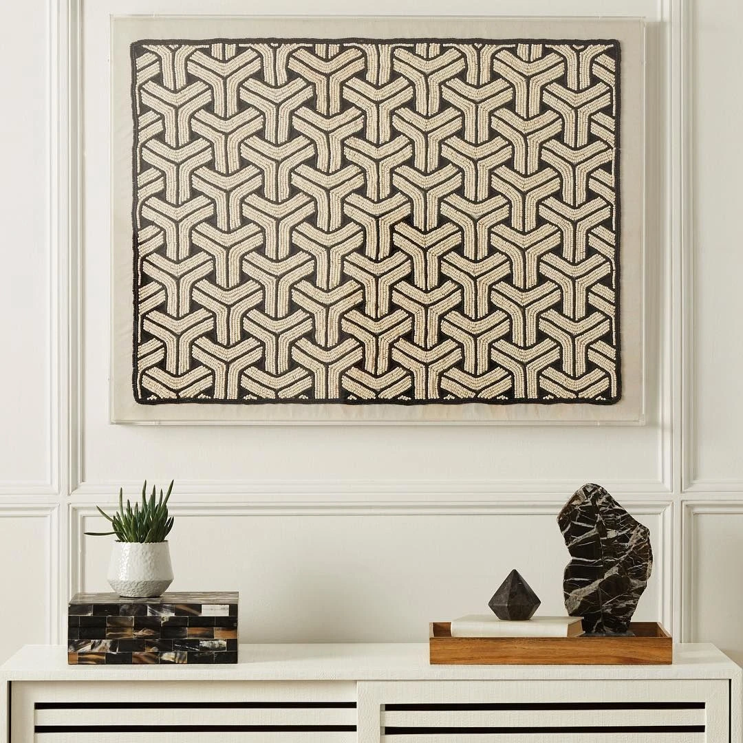 Natural materials meet pop art sensibilities in the graphic Zema Wall Art in large from Made Goods. Coco beads are handwoven to create the bold black-and-white rectangle pattern, encased in an acrylic frame for easy display.