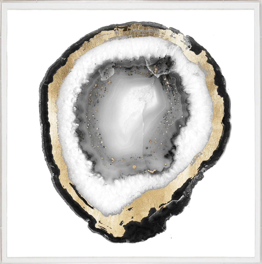 The Natural Curiosities presents the sophisticated Black and White Geode 1 photograph showcasing the geological idiosyncrasies of an ancient mineral, accentuated with hand applied gold leafing. The Black and White Geode by Natural Curiosities, subtly connecting us to epochs past, this contemporary artwork, framed in acrylic, makes a strikingly handsome statement throughout homes and offices!