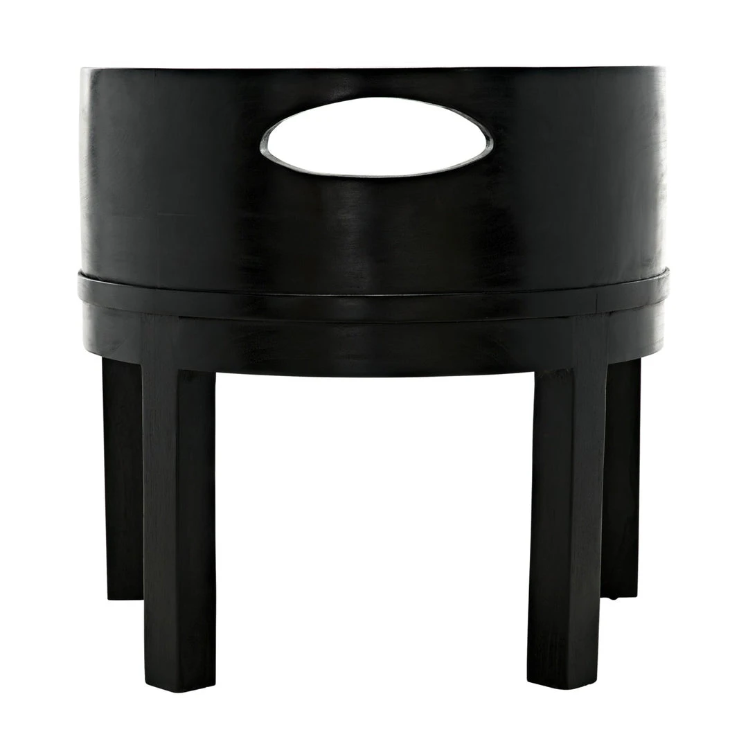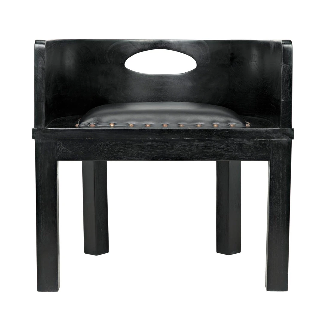 The Latour Chair in Charcoal Black Leather from Noir features a lower profile barrel shape in hand-rubbed black leather. The chic black leather seat is trimmed with burnished brass nailheads and an oval handle cutout at the back for easy movement. The Latour is perfect for dining tables, vanities, and desks alike.
