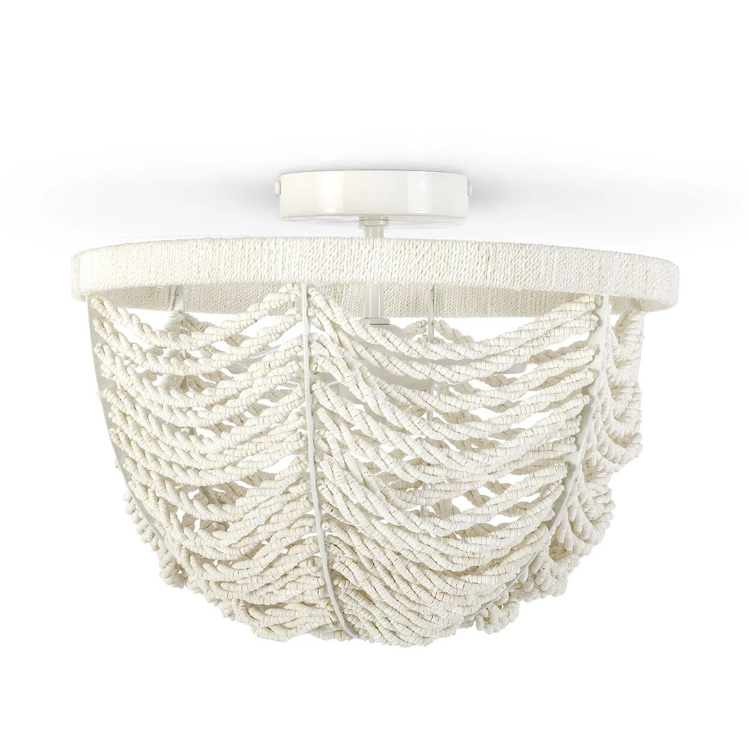 The Cabrillo Semi Flushmount from Palecek features twisted strands of coco beads draped over a powder-coated metal frame wrapped with abaca rope. This elevated-coastal ceiling light comes with a cream finish canopy hanging kit. *Professional installation recommended