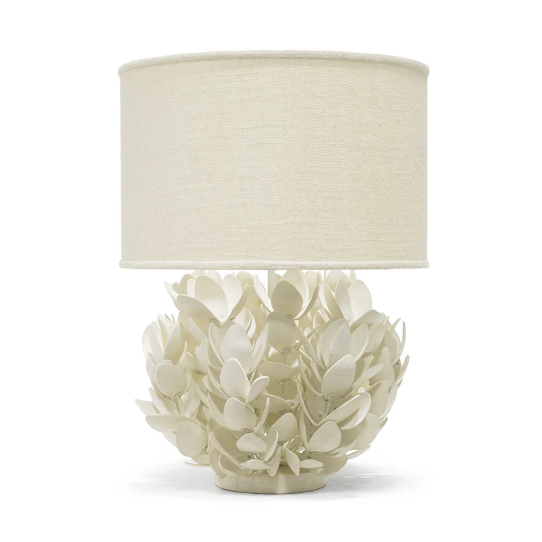 The Coco Magnolia Table Lamp from Palecek features hand-cut coconut shells in petal forms in an off-white finish with a cream burlap round drum shade and an inland shell finial. Natural markings and indentations are part of the inherent beauty of coconut shells and add interest to the piece.