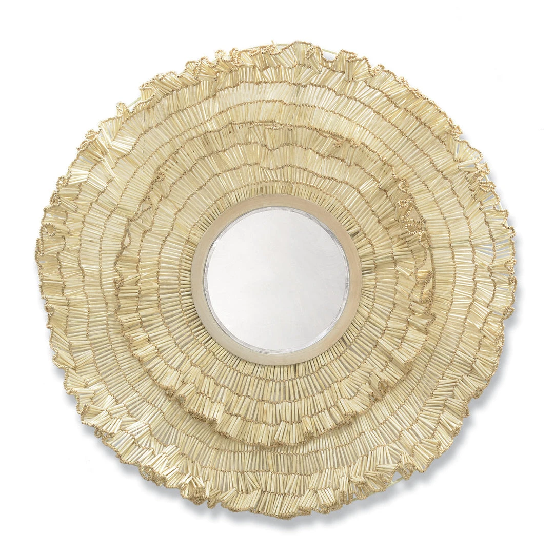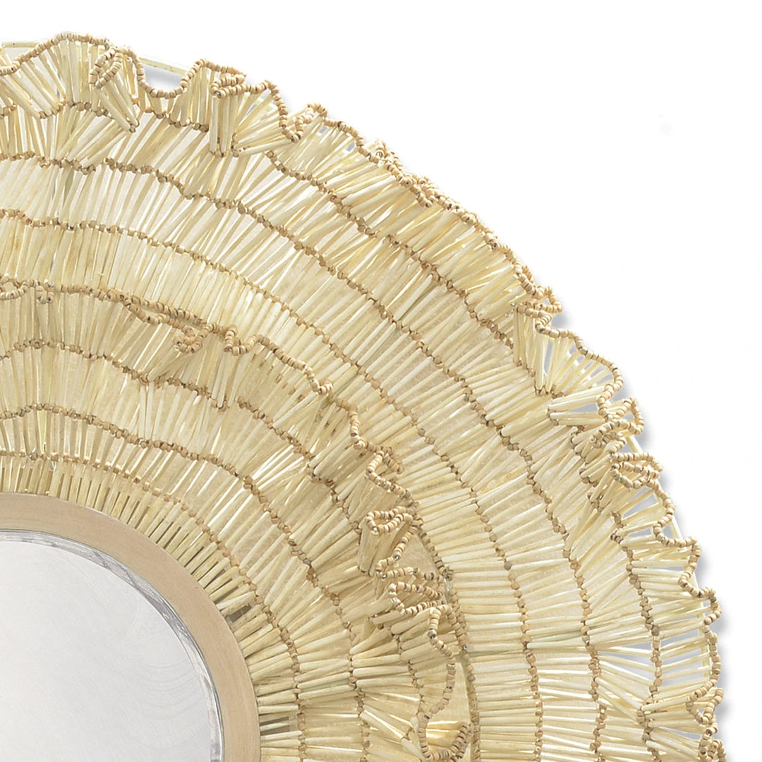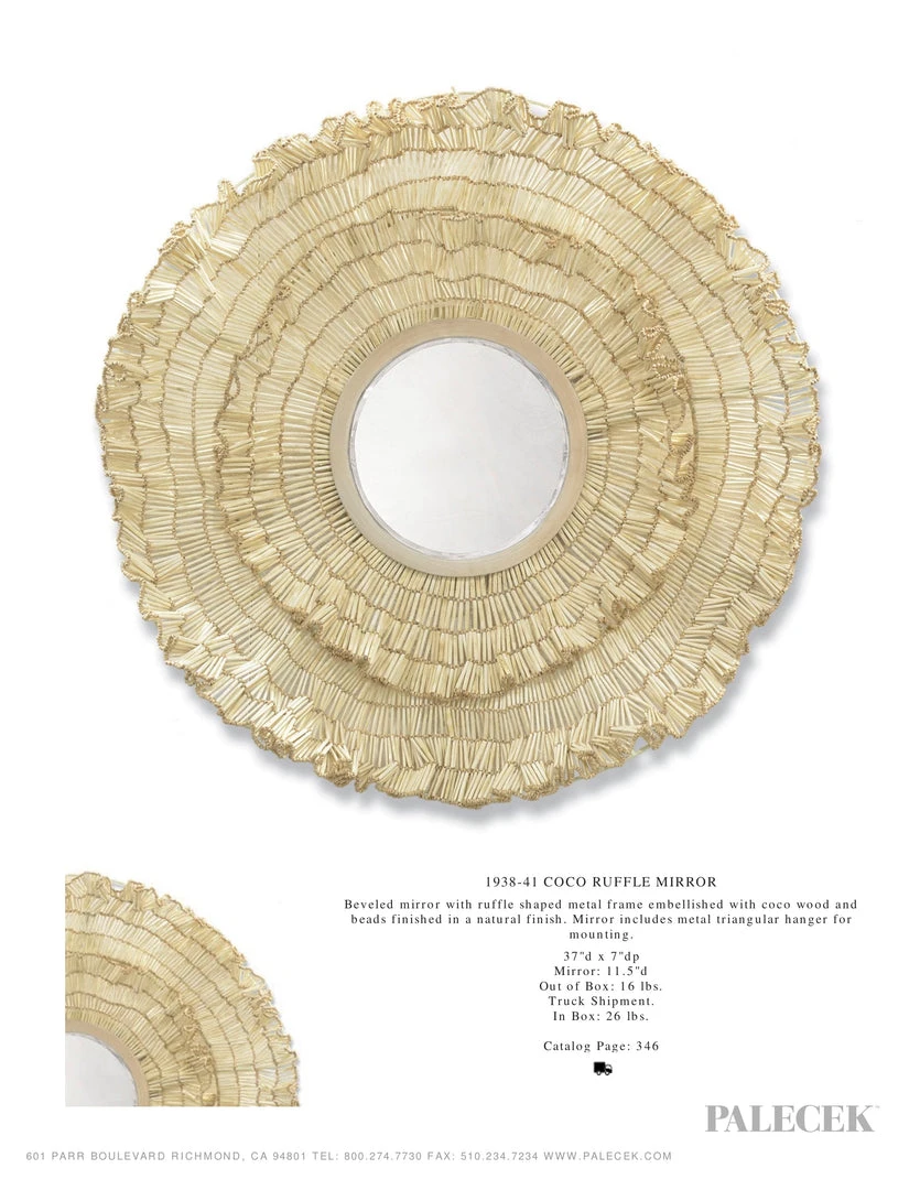Palecek presents the Coco Ruffle Mirror which captures a fresh coastal style for your home. A beveled mirror with a ruffle shaped metal frame embellished with coco wood and beads is finished in a natural finish. Display the Coco in hallways, bathrooms or living spaces for a breathtaking wall accessory. *Mirror includes a metal triangular hanger for mounting.