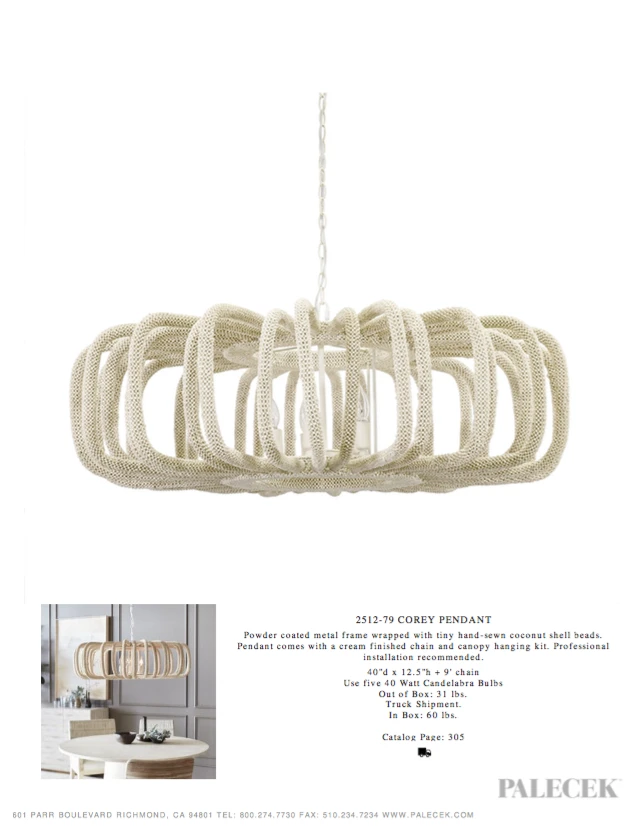 Palecek presents the Corey Pendant, delivering easy and elevated coastal style to any room in your home. A powder-coated metal frame is wrapped with tiny hand-sewn coconut shell beads and finished chain and canopy hanging kit. *Professional installation recommended.