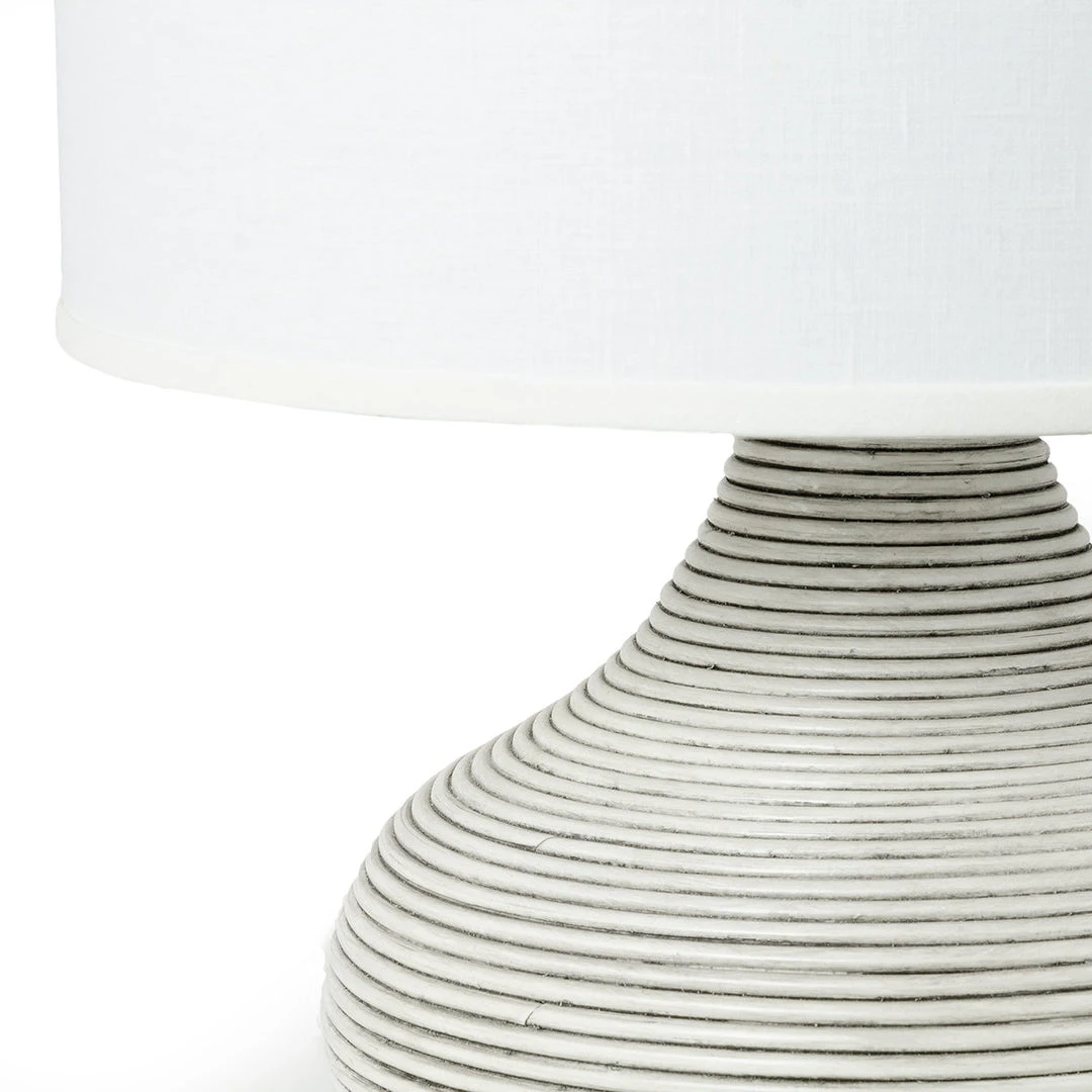 The Hewitt Table Lamp in Short Whitewash from Palecek features pencil pole rattan in a coil weave design. With a whitewash finish topped with a textured linen drum shade, an aluminum cylinder-shaped finial finishes the chic look of this lamp.*Also available in tall.