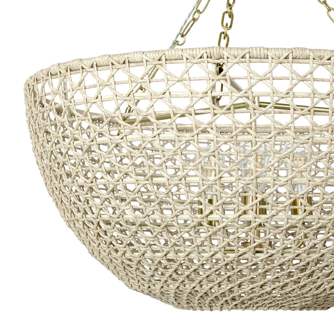 Hand-woven all-weather synthetic rope in an oatmeal color wrapped around a powder coated metal frame. The Montego Chandelier from Palecek comes with an antique brass finished chain and canopy hanging kit. Suitable for covered outdoor use in a damp location with no direct water contact. Professional installation recommended.