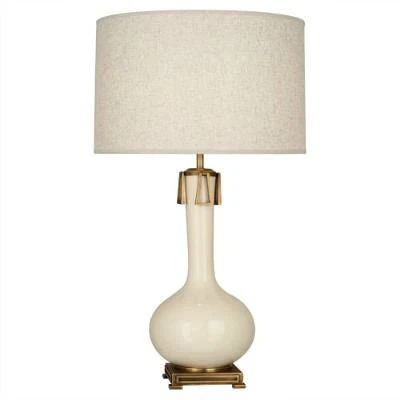 The Robert Abbey Athena Table Lamp in Bone offers a simple ethereal style. With aged brass accents at its neck and base the Athena Table Lamp adds clean sophistication to a dining room, entryway or bedroom. Finished with an open weave heather linen drum shade.