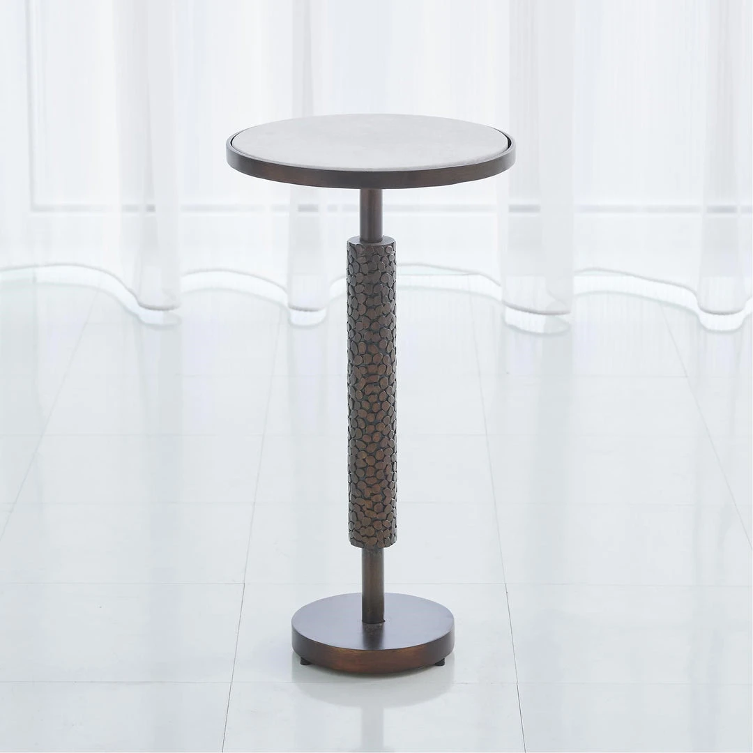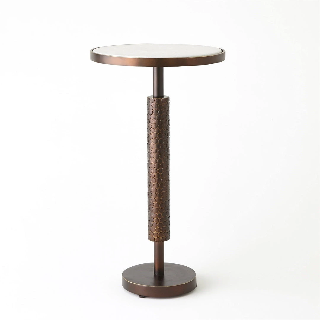 Beautifully textured with a pebble-like pattern, the Hammered Martini Table in Bronze with White Marble from Studio A furniture brings glamorous style to your home. Featuring an iron base with antique bronze finish and a sleek, white marble top, this versatile accent table works well in living spaces as a just right surface for entertaining guests.