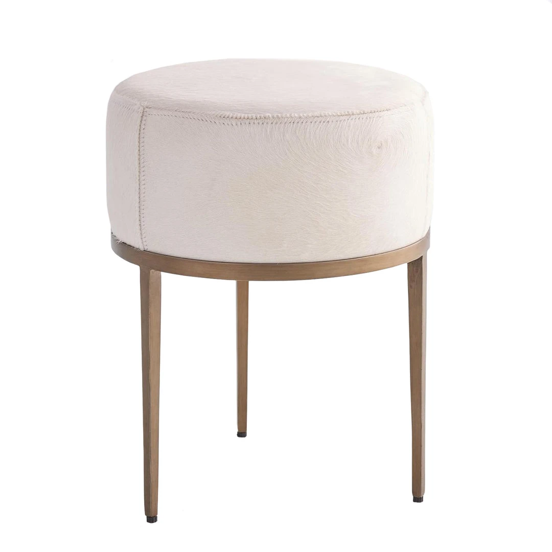 The Urban Stool in Ivory Hair on Hide with Antique Brass presented by Studio A is the perfect size for sliding under a vanity table or nestling near a sofa for a comfortable footrest. Covered in a luxurious and chic ivory hair on hide, the round cushion sits on an antique brass base with three tapered legs. This versatile seat works very well in modern, contemporary interiors and is a beautiful balance of form and function.