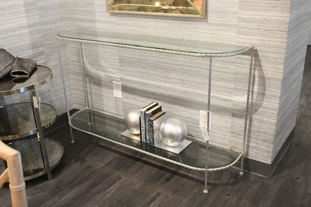 With its unique curved shape and minimalist profile, the Chauncey Console in Silver Leaf from Worlds Away is every designer’s dream! The beveled edge glass top and shelf provide generous surfaces for styling & storage. Hammered iron, silver leaf frame adds a welcome touch of glamour to your entryway, dining rooms, or living space.