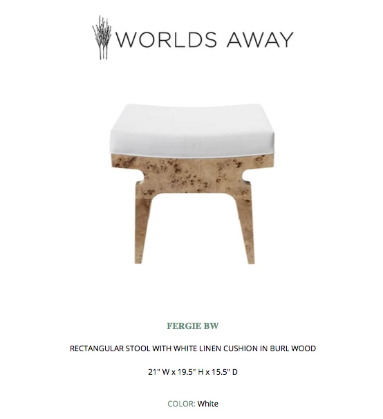 The Worlds Away Fergie Stool showcases a unique burl wood frame supporting an organic white linen cushion. Shaped as a rectangle, the Fergie from Worlds Away offers versatility and chic style for your home decor scheme. Used as extra seating or a place to rest your feet, the versatile Fergie is a statement piece from the foyer to the living room to the home office.