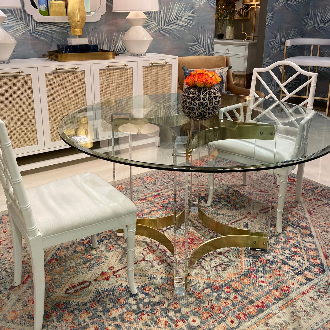 The Worlds Away Hendrix Acrylic Dining Table in Antique Brass showcases a contemporary shape with modern luxury. Crafted with and acrylic base and antique brass stretchers, the Hendrix delivers the ideal balance of dramatic designer style and functionality for your home. This round dining table by Worlds Away, available in two sizes, provides an elegant vibe for foyers, dining rooms, and breakfast nooks.
