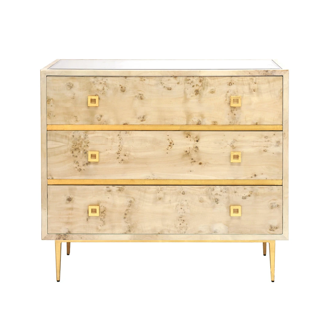 The Worlds Away Hudson Burlwood Chest features a gold leaf finished, 3 drawer cabinet with irregular patterns and small spots that give it a basic organic feel. Topped with a beautiful beveled inset mirror, the Hudson by Worlds Away creates an elegant ambiance in homes and offices! Use the modern, contemporary Hudson Burlwood Chest from Worlds Away anywhere in the home where extra storage and a statement piece are needed!