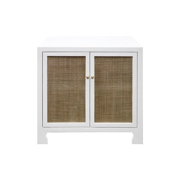 The Worlds Away Alden Cabinet in White Lacquer features two cane doors and brass hardware finishings. The versatile Alden Cabinet from Worlds Away can be used as a nightstand, cabinet between two accent chairs or as a sofa side table.