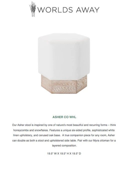 The Asher Stool in Cerused Oak and White Linen from Worlds Away is inspired by nature’s most beautiful and recurring forms – honeycombs and snowflakes. The Asher features a unique, six-sided profile, luxurious white linen upholstery, and a cerused oak base. A true companion piece for any room, the Asher can double as both a stool and upholstered side table.Â