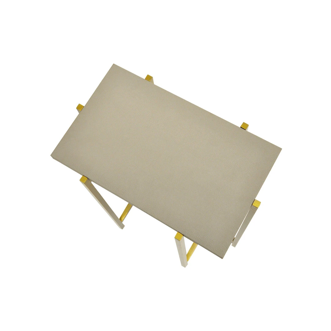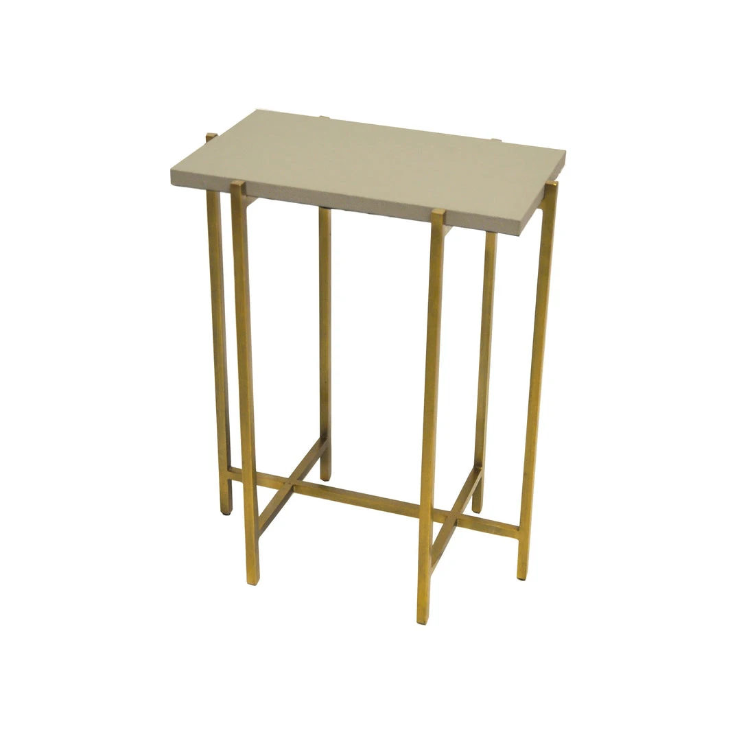 The Worlds Away Avni Side Table in Antique Brass and Gray Faux Shagreen captivates with chic designer style for your space. Featuring a luxurious partnership of a warm antique brass base and an sophisticated, rectangle faux shagreen tabletop, this accent table s sized just right for smaller spaces The Avni is the perfect accent table placed next to your favorite chair or sofa in your home or office.Â