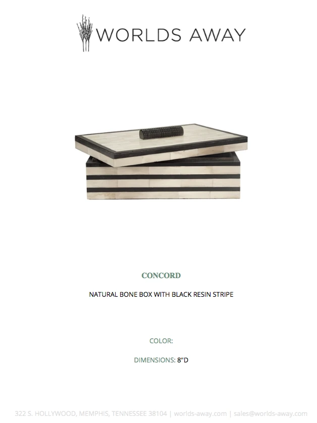 SKU: worlds-away-4699238301744 Categories: Boxes, Brands, Decor, New, New Arrivals, Worlds Away Tags: Black and white box, Bone and resin box, Box, Concord, Container, Worlds away, Worlds away box, Worlds away decorative box