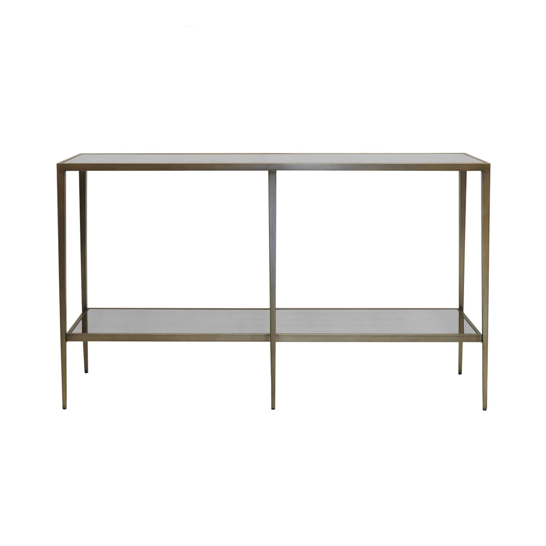 The Worlds Away Elaine Console Table showcases a warm bronze plated frame with tapered legs and two antiqued mirrored shelves. This striking console table mixes elegantly into a variety of modern to traditional decor schemes. The Elaine is fitting surface space for table lamps, sculptures, plants, and other decorative items. Place the Elaine from Worlds Away Furniture in the foyer, living room or dining room.