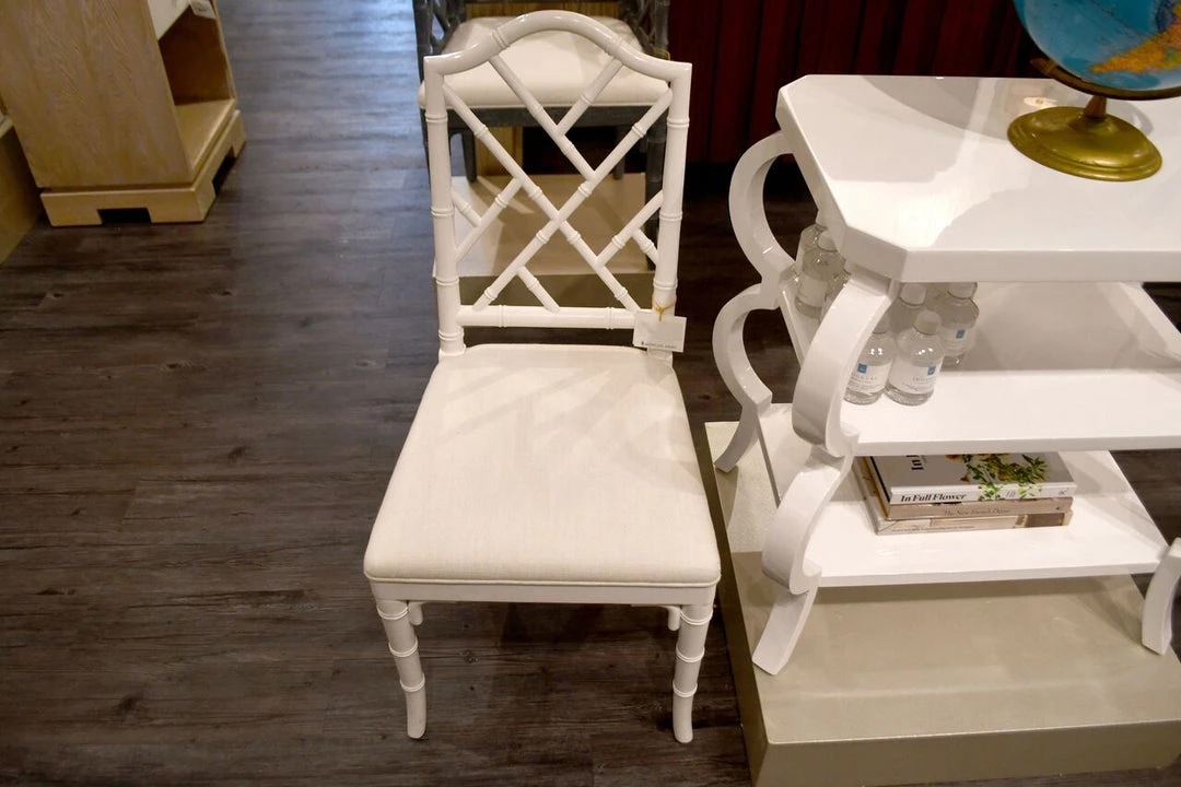 The Fairfield Chair from Worlds Away, features a glossy, white lacquer that looks instantly clean and modern. Â The Fairfield has an upholstered cushion and bamboo frame creating a stunning look for your home. Â Chairs like The Fairfield Chair from Worlds Away work beautifully as a set in a dining room or in pairs for extra living room seating.