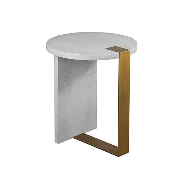The Harrington Side Table in Light Grey from Worlds Away showcases a faux shagreen wrapped finish. This neutral colored round accent table is highlighted with brass accents that complement the luxurious finish. Side tables like the versatile Harrington from Worlds Away furniture can be used as living room side tables or bedside tables.Â